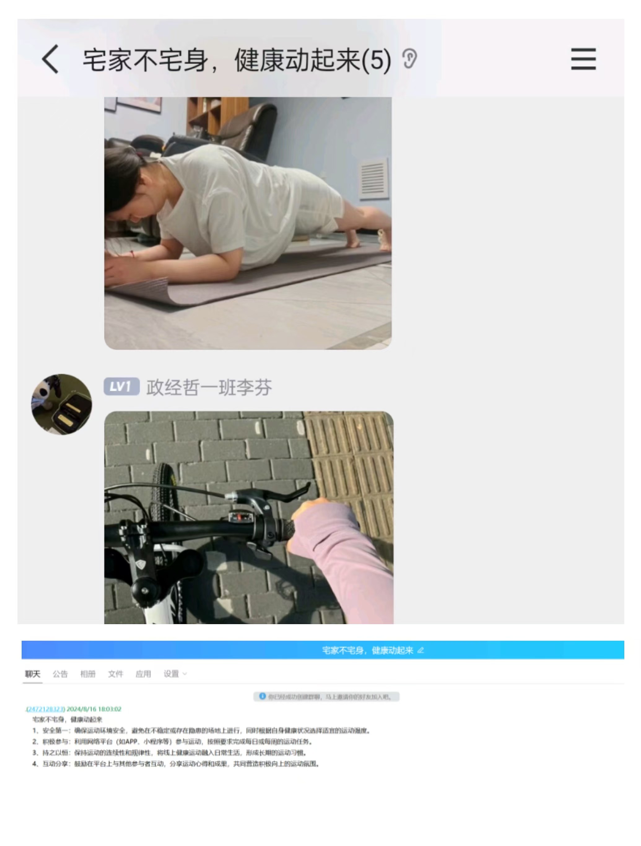 活动负责人向参与者介绍,本次的活动主题为打破传统“宅”文化中带来的久坐不动、缺乏锻炼的生活方式,引导参与者在暑期形成健康的运动、生活方式。活动期间,参与者们围绕主题拍摄照片、短视频等,展示参与者在暑期的健身训练、饮食计划、训练方案等内容,分享参与者认为最健康的健身运动方式。参与活动的员工们纷纷发挥创意,将家中客厅、阳台甚至卧室改造成临时的“健身房”,还有的员工创新性地开发了家庭版有氧运动课程,如跳绳、开合跳、原地跑等。其中,赵子豪分享他的健康饮食,懒人健康运动。为增强活动的互动性和趣味性,在线上交流平台中,参与者在这里分享自己的运动心得、成果照片和视频,相互鼓励、相互学习。活动结尾,负责人指出运动是增强员工身体素质的有效途径之一,希望参与者能够积极投身于体育锻炼,提高自己的身体素质,让自己拥有健康的身体。参与者尚姿璇表示:“参加此次活动需要老员工在无人监督的情况下,自觉地进行体育锻炼。这种自我驱动的运动习惯有助于培养我们的自律性和坚持精神,同时预防亚健康。”