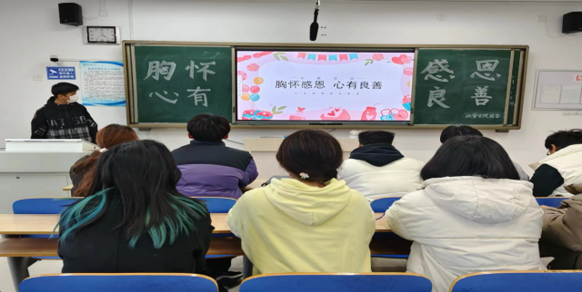 主讲人潘浩杰以近期热点新闻为切入点,通过图片、视频和文字相结合的方式初步使同学们对感恩产生共鸣。随后,主讲人潘浩杰从感恩的详细释义、为何要感恩、我们该如何心怀感恩以及树立目标,励志奋进四个方面,通过提问和观看视频等形式,带领同学们进一步加深对感恩的理解,让大家明白了感恩能够增进人与人之间的情感联系,推进构建和谐社会。在提问环节,主讲人潘浩杰采用“击鼓传花”等有趣方式,鼓励同学们分享自己身边的感恩故事,这不仅活跃了活动气氛,增加同学们对活动的参与感,而且增强了同学们体察生活的能力。接着,以同学所分享的身边感恩小故事为例,引出伟人的感恩事迹,讲述了孙中山先生住院期间对护理人员的感恩以及朱德将军对母亲养育之恩的感激与回报。活动最后,刘敬峰同学表示感恩是一种积极向上的生活态度,良善是一个人基本的道德品质,胸怀感恩之情不仅能够使我们感悟生活中的幸福和满足,还能保持良好的心态投入日常学习。