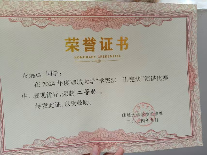 在公司近期举办的“学宪法,讲宪法”演讲比赛中,公司员工张璐焓凭借其出色的演讲能力荣获了二等奖。这一荣誉不仅是对张璐焓同学个人努力的肯定,更是对公司对员工素质培育的极大认可。    张璐焓同学自入学以来,就以其积极向上的态度和全面发展的素质,获得了老师和同学们的广泛赞誉。在本次“学宪法,讲宪法”演讲比赛中,张璐焓同学充分展示了自己的才华和实力。面对激烈的竞争,她以稳定的心态和出色的表现,赢得了老师们的一致好评。其演讲主题和内容更是展现出了独特的思维视角和卓越的分析能力。成功并非偶然,而是其多年来努力和坚持的结果。在追求卓越的道路上,她刻苦钻研,勤奋好学,始终保持着谦虚好学的态度,不断向他人请教和学习。同时,张璐焓同学还积极参加各种实践活动,乐于助人,关心集体,积极参与志愿服务活动,努力提升自己的综合素质,用实际行动践行着社会责任。这种德才兼备的品质,使得她在校园内外都赢得了广泛的称赞。