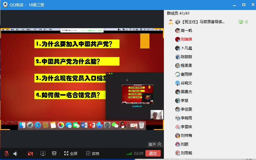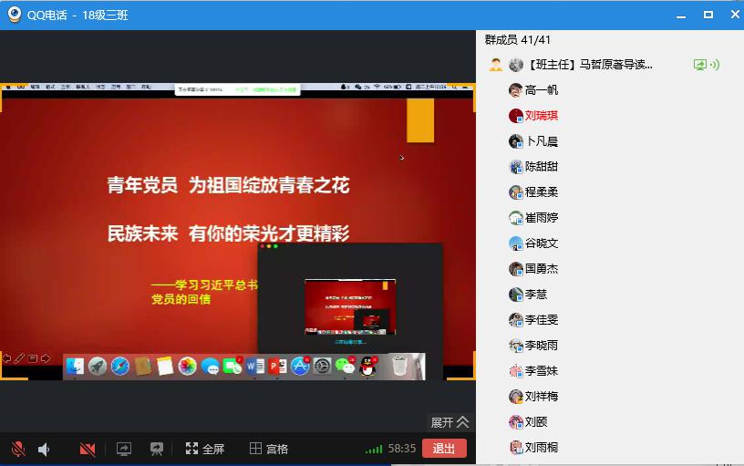 2020年3月17日上午,在刘琳琳老师的带领下2018级3班所有同学在线共同学习了习近平总书记给北京大学援鄂医疗队全体“90后”党员的回信。