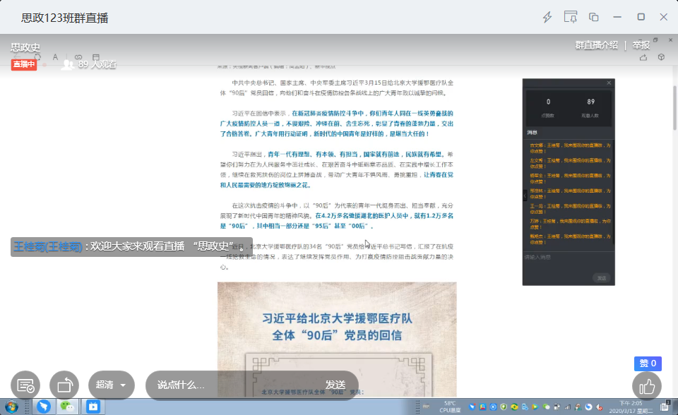 学习和交流中,同学们纷纷向战斗在疫情防控一线医务人员的奋斗精神表达了敬意,表示要学习他们身上的责任与担当要以援鄂医疗队全体90党员为榜样,积极响应党和国家的号召,为祖国奉献出自己的力量。