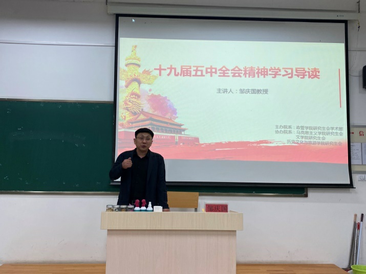 邹庆国教授从深刻认识全会召开的历史背景、全面把握全会的精神要义和方向指引以及怎样做中国特色社会主义合格的接班人和建设者三方面解读十九届五中全会精神。邹庆国教授深入浅出地为同学们讲解了十九届五中全会精神。