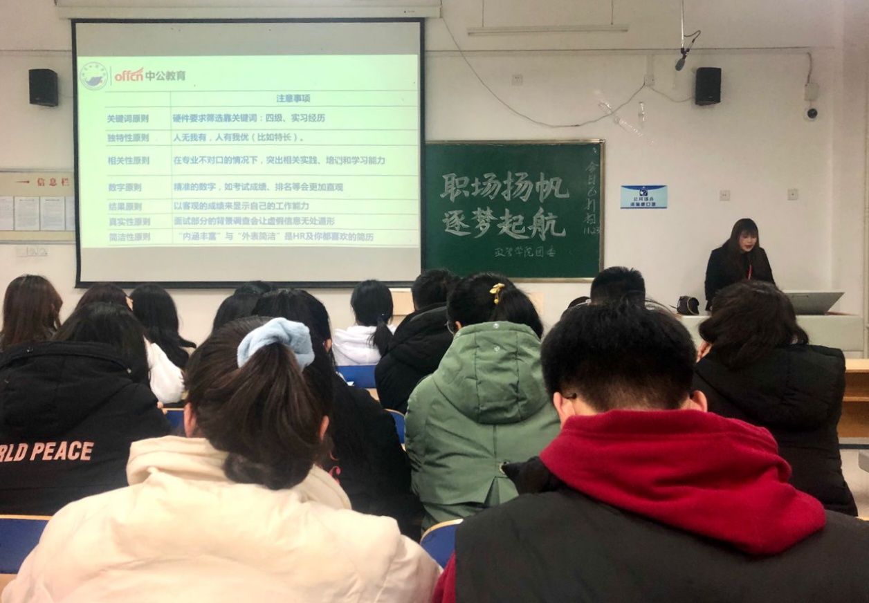 为加强老员工对当前就业形势的了解,明确就业目标,提高大家就业技能,同时使同学们充分认识自我,树立竞争性的择业观,做好就业决策及就业准备,11月25日,公司于东校区6#c301开展“职场飞扬,逐梦未来”中公教育就业讲座活动。