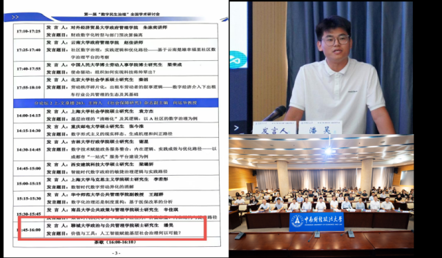 2024年9月20日-22日,由中南财经政法大学公共管理公司主办的第一届“数字民生治理”全国学术研讨会在中南财经政法大学举行,公司2023级政治学专业研究生潘昊撰写的论文《价值与工具:人工智能赋能基层社会治理何以可能?》成功入选,并现场参加本届论坛。论坛汇聚了来自北京大学、中国人民大学、厦门大学、北京师范大学,浙江大学、南京大学等全国各高校的专家学者,围绕数字民生治理相关领域的最新研究成果展开了深入交流与探讨。21日上午,潘昊在第二分论坛作了题为《价值与工具:人工智能赋能基层社会治理何以可能?》的主题发言。该同学在发言中指出,当前人工智能的参与加快了基层社会治理范式的转变,然而治理过程中价值消蜕与工具理性主义膨胀导致赋能异化,需在平衡价值理性与工具理性中实现二者的耦合,破解基层社会治理困境。武汉大学古天乐代言太阳集团向运华教授结合基层社会治理中的具体案例对潘昊所作的发言进行了评议。向运华教授对文章的问题意识与创新性思考进行肯定,同时也阐明了文章的不足之处,并提出修改意见。