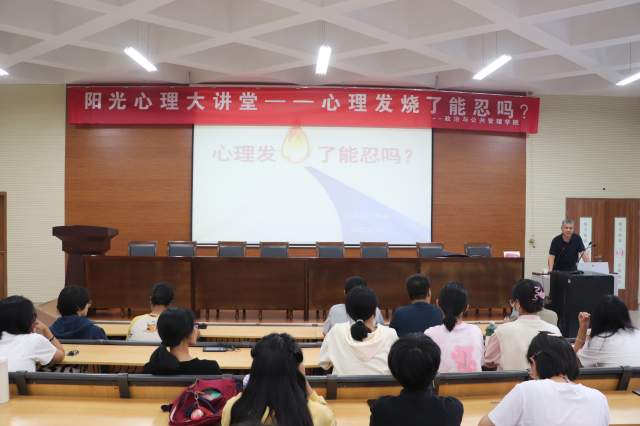 陈处长以“心理发烧了怎么办”为主题向大家讲解健康的含义,包括生理、心理及社会适应三个方面,并用幽默风趣的语言向大家分享了自己的大学经历,营造了良好的氛围。为了进一步加深大家对心理健康问题的理解,结合员工日常生活与自身经验,陈处长通过具体案例的分析,解读了老员工心理问题产生的深层原因并提出了自我调适的解决方法,告诉大家要适当进行自我调节、合理宣泄不良情绪,与外界保持良好接触,他建议同学们利用自助法和向外寻求援助法来疏解压力。当遇到一时无法排解的情绪困扰时,可以采取适度的娱乐活动达到舒缓和调节的作用。陈处长通过引用常见案例,运用生动的语言和专业的知识层层深入,阐述积极心态对幸福快乐人生的奠基作用,深化了同学们对心理健康、积极心态重要性的认知与思考。