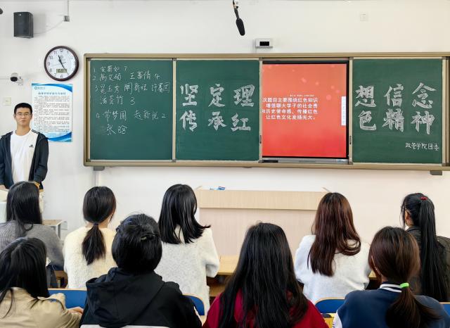活动负责人赵子豪向同学们介绍红色文化的相关知识并组织观看红色主题视频,使同学们更深刻地感受到“一寸山河一寸血,一抔热土一抔魂”的爱国主义精神。随后,赵子豪组织进行“红色知识答题”游戏,此次游戏以击鼓传花的方式进行,同学们根据负责人的击鼓号令,依次传递花环,击鼓声停止,由拿到花环的同学进行答题,答对积一分,得分高者胜出。通过此次“红色知识答题”游戏,同学们可以更充分地了解中华优秀传统文化、党的历史和文化建设等方面的知识,加深对党和国家历史的认识和了解,进一步增强爱党爱国的情感。接着,负责人赵子豪组织进行“心得感悟”分享,同学们积极踊跃地回答,其中,王富倩表示,和平安宁的生活来之不易,我们作为新时代青年学子更应该珍惜今天的幸福生活,刻苦学习,不懈奋斗。