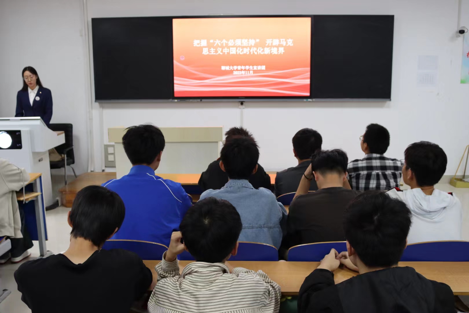 本次思政课由宣讲团成员谢梦洁领学,包括六个“必须坚持”的逻辑关系、深刻内涵和如何把握六个“必须坚持”三部分。谢梦洁通过引用习近平总书记在中国共产党第二十次全国代表大会上的报告,阐释了六个“必须坚持”的逻辑关系。随后,谢梦洁结合视频,生动形象向同学们讲解了六个“必须坚持”的内涵,即人民至上、自信自立、守正创新、问题导向、系统观念和胸怀天下。谢梦洁提出,只有做到坚定理想信念、坚持学以致用、站稳人民立场,才能牢牢把握好这六个“必须坚持”,真正落实马克思主义中国化时代化。进入宣讲小结,谢梦洁首尾呼应,再次引用习近平总书记勉励青年的话,号召同学们要担当起创新发展的历史重任,把理论知识融入学习生活中,在思维的碰撞中激发创新活力。本次宣讲得到同学们的一致好评,纷纷表示会在今后的学习生活中贯彻实践创新精神,努力奋斗。