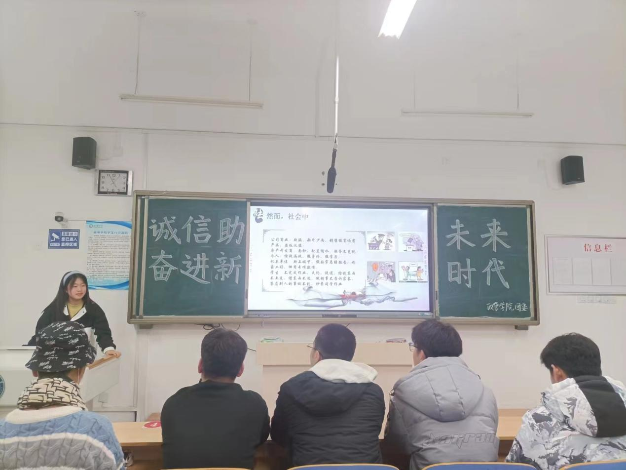 本次活动从什么是诚信,诚信的故事、诚信的格言、不诚信的表现以及如何践行诚信这五个方面展开。诚信,既是中华民族的传统美德,也是社会主义核心价值观个人层面的价值准则,更是塑造员工健康人格,实现人生价值的道德基石。活动主讲人王梦洁通过放映视频和讲述故事的形式,生动形象地为同学们讲述了诚信的重要性和不遵守诚信可能带来的严重后果和损失。每位同学都准备了一则诚信小故事和他们日常见过或者做过的一些不诚信的事并与大家分享、反思。随后同学们被分为两两一组,一位同学讲一则诚信故事,另一位同学猜故事代表的成语,用时最少的一组胜出。赵子豪同学列举了一些在日常生活、学习、待人接物上讲求诚信的例子,他表示,诚信是指诚实不欺,讲求信用,人与人之间应该真诚相待,言而有信,做到诚信需要我们勇于承担责任,实事求是。活动结尾,主讲人王梦洁带领同学们一起唱了八荣八耻诚信之歌,让同学们深刻理解诚信做人的含义。