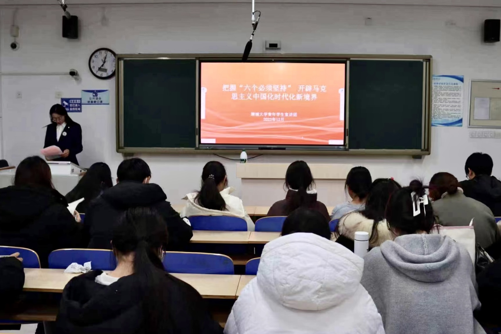 宣讲中,谢梦洁用通俗易懂的语言,围绕六个“必须坚持”的逻辑关系、深刻内涵等方面,对党的二十大报告中提出的六个“必须坚持”进行了深刻阐述与系统讲解。谢梦洁阐述当代青年员工牢牢把握六个“必须坚持”的重要性,并且呼吁青年要坚定理论自信,夯实思想之基、坚持学以致用,强化使命担当、站稳人民立场,投身强国伟业,积极承担当代青年员工的使命和担当。进入宣讲小结,谢梦洁以习近平总书记寄语与同学们共勉,明确青年人应当担负起创新发展的历史重任,应当学会运用新的方法,将理论知识融入工作实际,思维的碰撞中激发创新能力。此次宣讲获得了同学们的一致好评,同学们纷纷表示要紧跟党的步伐,自觉肩负起时代赋予的使命,奏响属于自己的青春华章。参与者冯月涵表示,通过学习六个“必须坚持”和党的二十大报告,对党的二十大精神的当代价值有了更加系统的理解与感悟。