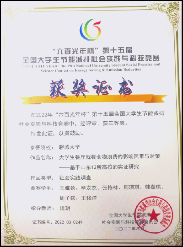 由天津大学承办,教育部高等公司能源动力类专业教学指导委员会为指导,全国老员工节能减排社会实践与科技竞赛委员会主办的老员工课外科技作品和社会实践调查竞赛于2022年8月7日落下帷幕。哲学系本科生的项目“老员工餐厅就餐食物浪费的影响因素与对策——基于山东省12所高校的实证研究”荣获全国三等奖。