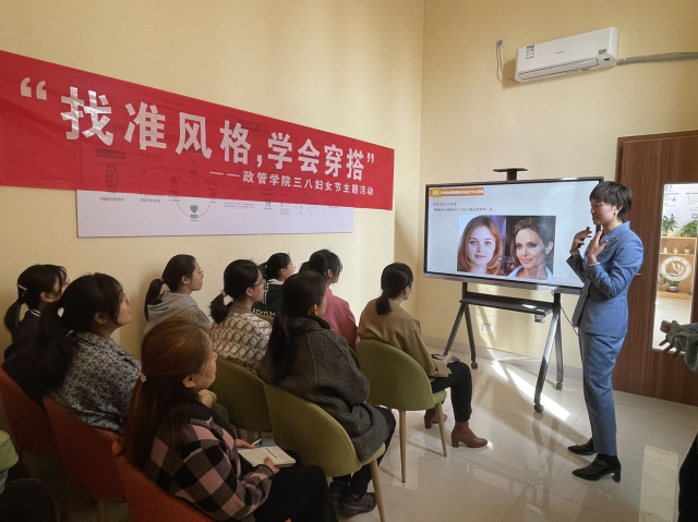 活动围绕“快速知道自己适合什么风格”、“扬长避短修饰身材”、“更显白的三个小技巧”以及“配饰与风格协调”四大模块展开。陶珊珊以图文展示这种通俗易懂的形式进行讲解,将每个大模块分解为许多小模块,详细地为女性师生们讲解穿搭技巧。从服饰到搭配,从明星到普通人,陶珊珊用对比与举例的方式形象地指出了什么才是适合自己的、什么才是有效的穿搭。师生们完全投入到了此次活动中,积极进行互动。活动结束后,贾明慧表示通过此次活动,自己学到了很多实用技巧,开拓了自己的思路,并将在日后的生活中将这些技巧付诸于实践,逐步提高自己的穿搭能力,提升自己的形象。