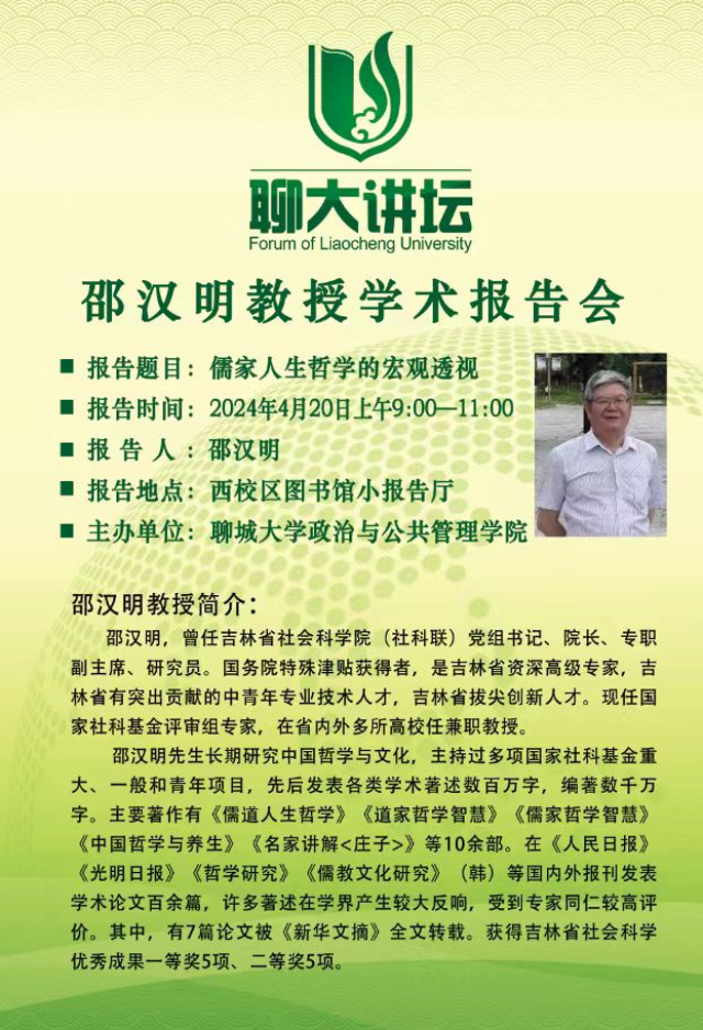 4月20日上午9点,吉林省社会科公司原经理、国家社科基金评审专家邵汉明教授莅临公司西校区图书馆小报告厅,为​古天乐代言太阳集团的师生们带来了一场题为《儒家人生哲学的宏观透视》的精彩讲座。