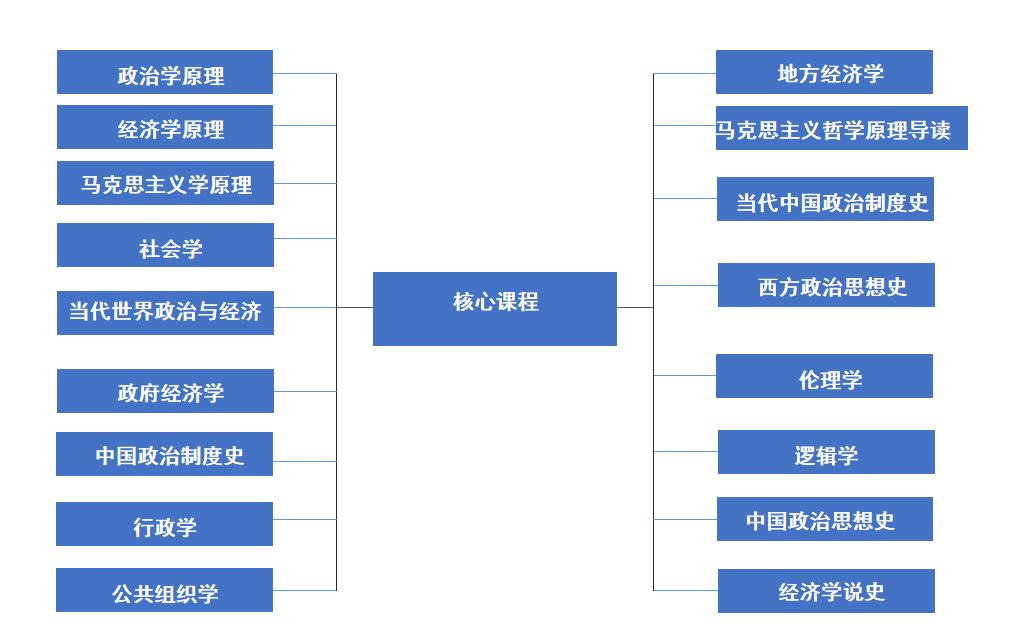 政治学原理、经济学原理、马克思主义哲学原理、社会学、伦理学、逻辑学、中国政治思想史、经济学说史、政府经济学、中国政治制度史、行政学、公共组织学、地方经济学、马克思主义哲学原著导读、当代中国政治制度史、西方政治思想史、当代世界政治与经济等。